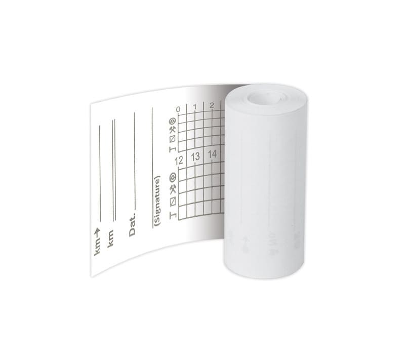 Для распечатки отчетов с тахографа о работе водителей используется специальная термобумага. Отличительной чертой данной бумаги от кассовой ленты является то, что она имеет меньший диаметр ролика и обладает более высокой стойкостью к выцветанию. Плюс на обратной стороне ленты имеется специальная сетка для нанесения данных вручную в случае неисправности принтера.